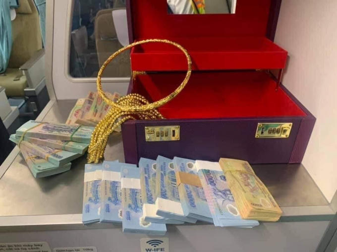 Khi mở vali, kiểm tra bên trong có: 200 triệu đồng tiền mệnh giá 500 ngàn đồng; 100 triệu đồng tiền mệnh giá 200 ngàn đồng và 15 triệu đồng tiền mệnh giá 20 và 10 ngàn đồng, 1 vòng cổ và 1 chuỗi vòng bằng vàng 9999.