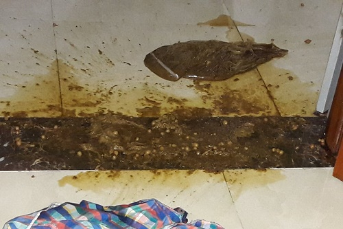 | PV tiếp tục bị "khủng bố" trước cửa phòng bằng phân trộn lẫn ruốc và hành tăm khiến cả tầng chung cư bốc mùi hôi thối |
