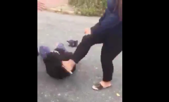 Hình ảnh một trong hai nữ sinh bị đánh đập hội đồng giữa ban ngày (ảnh cắt từ clip).