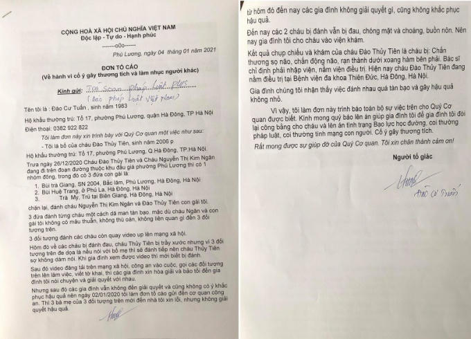 Nội dung đơn thư anh Tuấn nếu "Trưa ngày 26/12/2020 Cháu Đ. T. T và Cháu N. T. K N. đang đi trên đoạn đường thuộc khu đầu giá phường Phú Lương thì có 1 nhóm đông, trong đó có 3 đối tượng gồm; Bùi Trà Giang, (SN 2004, Bắc lãm, Phú Lương, Hà Đông, Hà Nội); Bùi Huệ Trang, (Phú La, Hà Đông, Hà Nội) và Trà My, (trú tại Biên Giang, Hà Đông, Hà Nội) chặn lại, đánh cháu N. T. K N. và Đ. T. T con gái tôi".