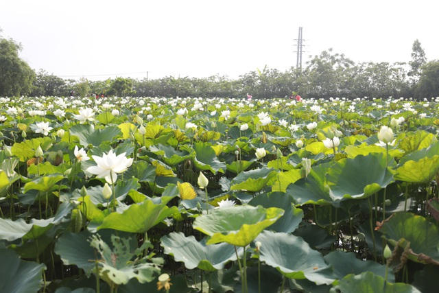 Đầm sen trắng ở Thanh Oai (Hà Nội) đang là điểm check-in, chụp ảnh được bạn trẻ yêu thích. Nữ sinh Cao Thu Trang cũng ghé thăm, thực hiện bộ ảnh lưu giữ vẻ đẹp tuổi xuân bên hoa sen