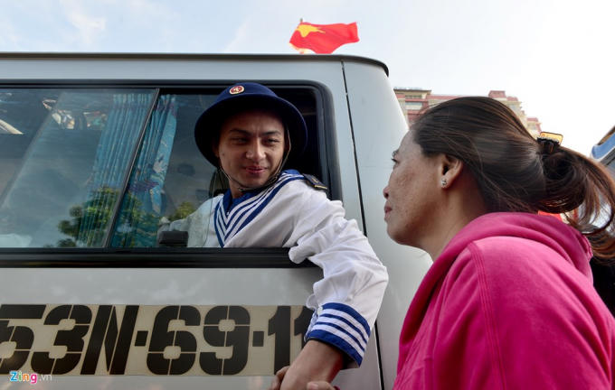 Dương Ngọc Trung (20 tuổi, quận 7), là thợ điện lạnh được gọi lên đường nhập ngũ vào đơn vị Lữ đoàn 146 Vùng 4 Hải quân (Cam Ranh, Khánh Hòa). "Lần đầu tiên cháu xa nhà lâu ngày nên tôi sẽ rất nhớ nhưng hy vọng qua môi trường quân đội cháu sẽ trưởng thành, cứng cáp hơn", chị Nguyễn Thị Ngọc Thúy, mẹ tân binh này chia sẻ.