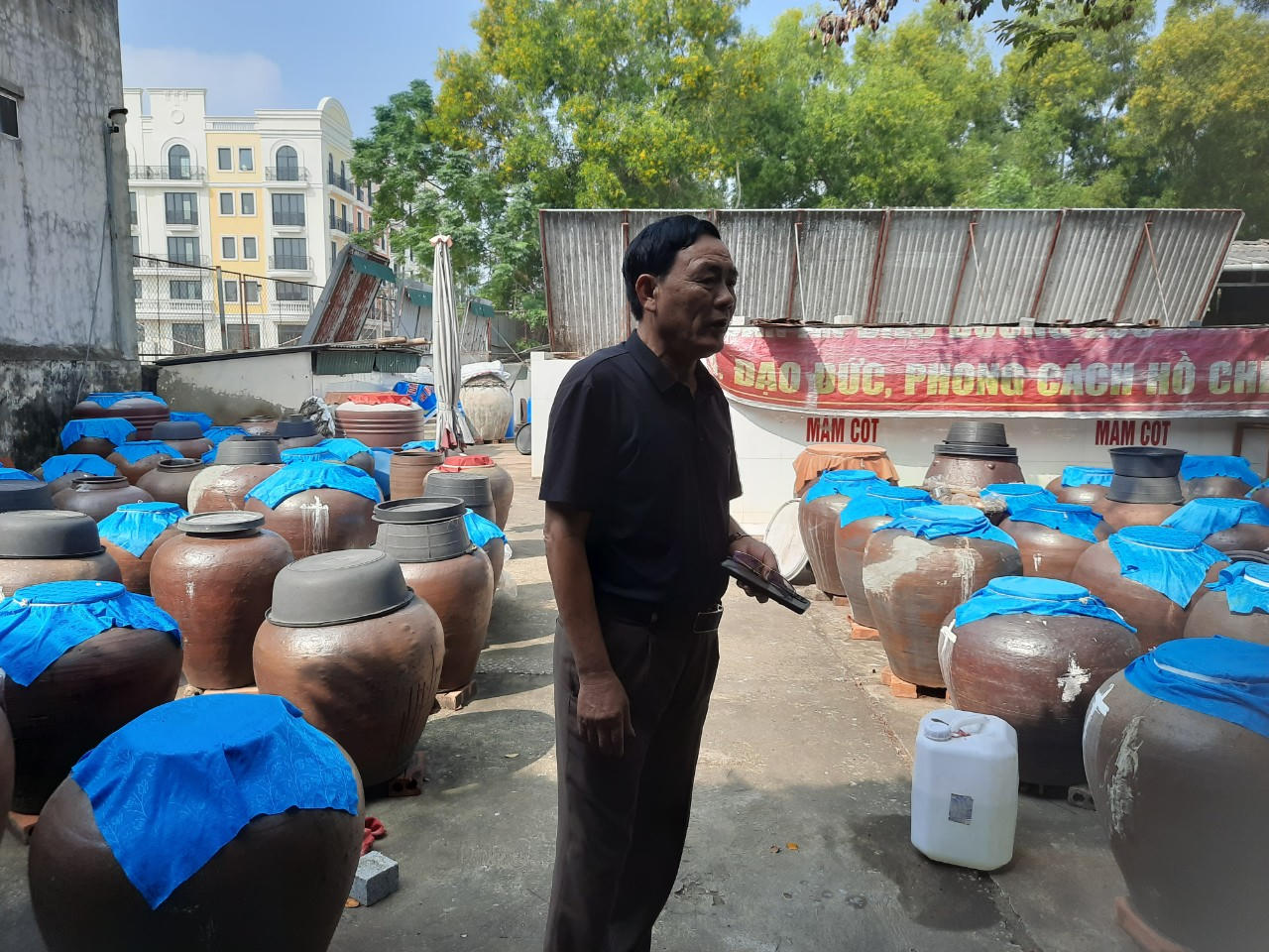 Ông Lê Cao Đồng bên cạnh những chum mắm đã được chắt lọc và những