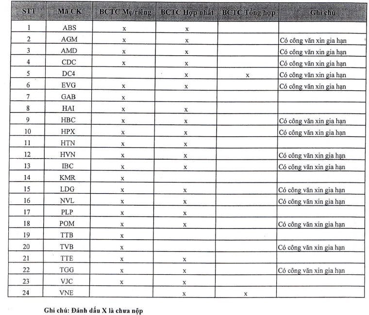 Tuy nhiên, đến hết thời hạn nộp báo cáo, HoSE vẫn chưa nhận được Báo cáo tài chính kiểm toán năm 2022 của 24 công ty trong danh sách dưới đây và đề nghị các doanh nghiệp này khẩn trương công bố thông tin đúng quy định.