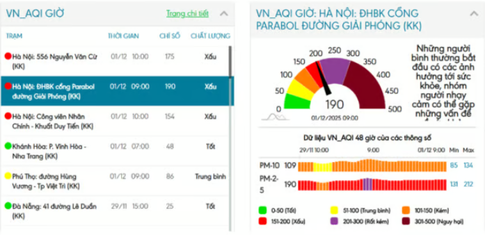 Ngày 1/12/2025, nhiều trạm quan trắc tại Hà Nội ghi nhận chỉ số AQI ở mức “đỏ” (xấu), thậm chí một số nơi tiệm cận mức “tím” (rất kém), cảnh báo nguy cơ sức khỏe nghiêm trọng.