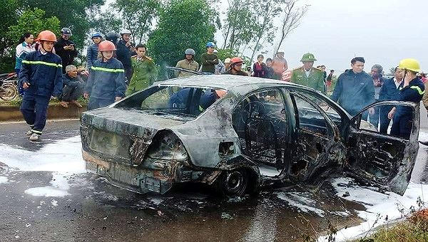 Ô tô chở 2 người đột nhiên bốc cháy trên đường