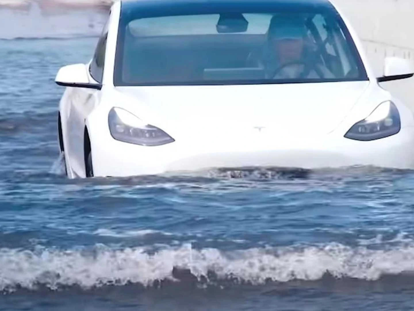 Xe điện Tesla Model 3 đang thử nghiệm đi qua vùng nước sâu tại Trung Quốc (Ảnh:Insideevs).