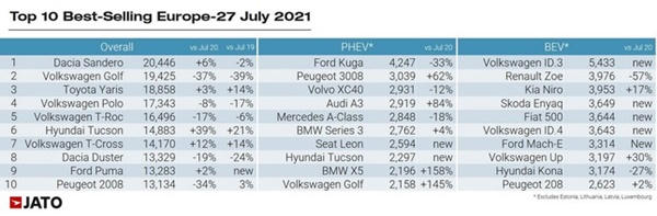 Trong khi đó, mẫu xe mới bán chạy nhất ở châu Âu trong tháng 7/2021 là Dacia Sandero với doanh số 20.446 chiếc, tiếp theo là Volkswagen Golf với 19.425 chiếc, Toyota Yaris với 18.858 chiếc, Volkswagen Polo với 17.343 chiếc và Volkswagen T-Roc với 16.496 chiếc. Về xe Hybrid sạc điện, mẫu ô tô bán chạy nhất là Ford Kuga với 4.247 lượt đăng ký, đánh bại Peugeot 3008 với 3.039 chiếc và Volvo XC40 với 2.931 chiếc.