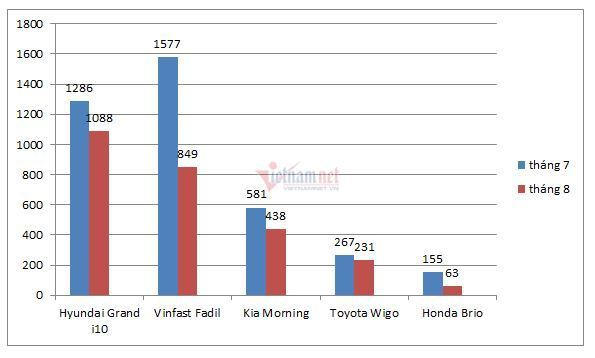 Nguyên nhân có thể do tâm lí người tiêu dùng không muốn nhận xe trong tháng 7 Âm lịch, hầu hết các mẫu xe trong phân khúc này đều có doanh số giảm so với tháng trước. Cụ thể, Hyundai Grand i10 giảm 198 xe, VinFast Fadil giảm 728 xe, Kia Morning giảm 143 xe, Toyota Wigo giảm 36 xe, Honda Brio cũng giảm 92 xe...