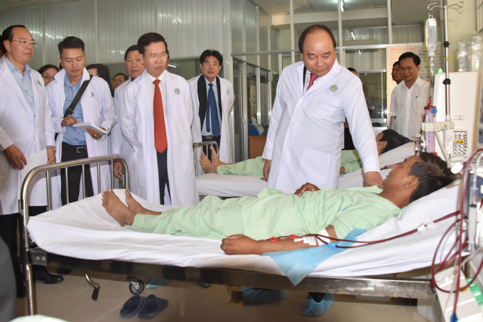 | Thủ tướng Nguyễn Xuân Phúc và Trưởng ban Tuyên giáo Trung ương Võ Văn Thưởng thăm bệnh nhân tại Bệnh viện đa khoa tỉnh Vĩnh Long. |