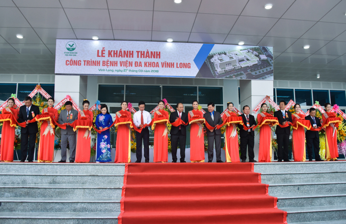 | Thủ tướng Nguyễn Xuân Phúc, Trưởng Ban tuyên giáo Trung ương Võ văn thưởng cùng lãnh đạo Bộ Y tế, tỉnh Vĩnh Long, Ban giám đốc bệnh viện cắt băng khánh thành. |