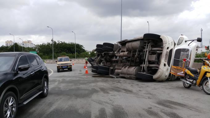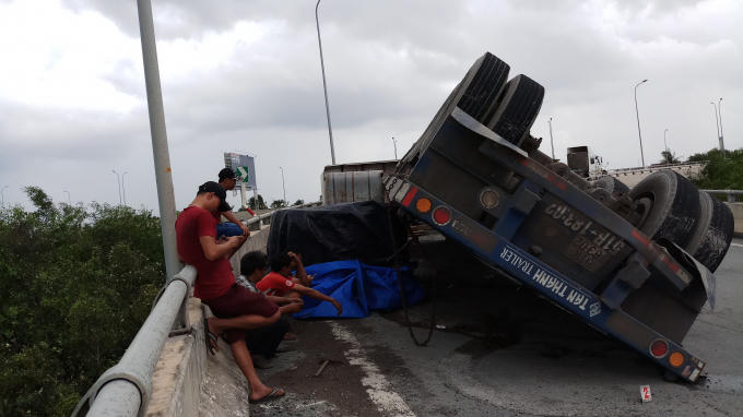 Theo thông tin ban đầu, khoảng 13h chiều cùng ngày, xe đầu kéo biển số 51D-105.31 chở theo hai cuộn sắt nặng hàng chục tấn chạy trên đường dẫn lên cao tốc TP HCM - Long Thành Dầu giây hướng từ nút giao vành đai 2 về quận 2.