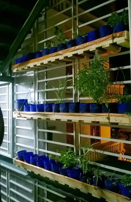 Cũng trồng một vườn rau sạch trên sân thượng, nhưng khác với phương pháp thông thường, ông bố trẻ Nguyễn Hồng San chọn cách trồng cây trong túi vải và máng nước khá độc đáo và lạ mắt.