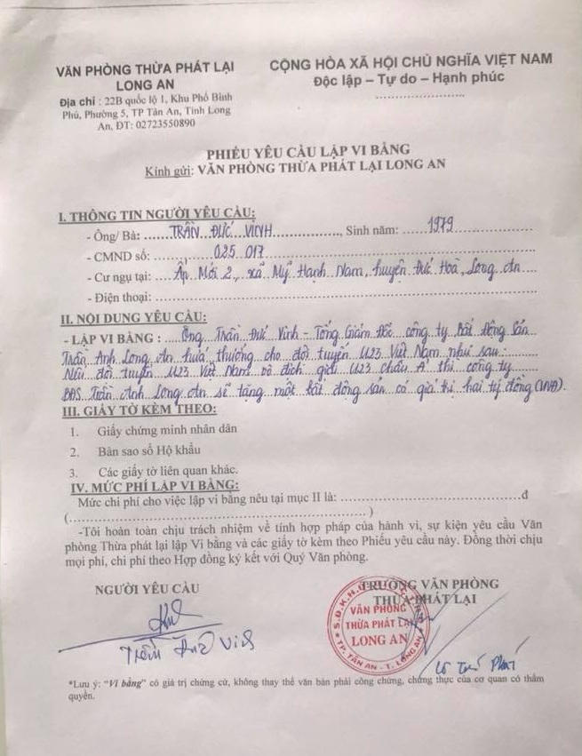 Đích thân Tổng Giám đốc Công ty BĐS Trần Anh Long An đã đến văn phòng Thừa phát lại Long An để tiến hành lập vi bằng,về việc hứa thưởng cho đội tuyển U23 Việt Nam một căn hộ bất động sản có giá trị 2 tỷ đồng nếu vô địch giải U23 châu Á năm nay.