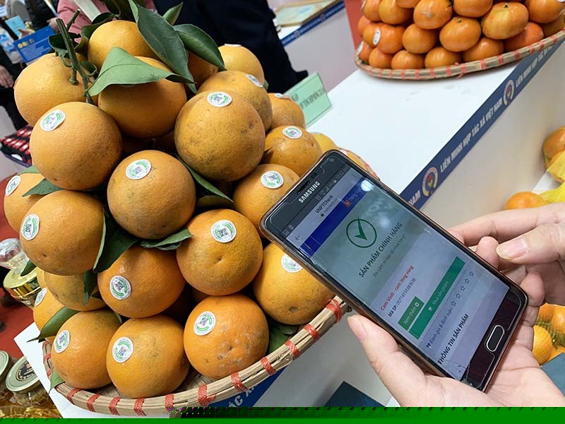 Đứng trước quầy trưng bày đủ các loại cam lòng vàng, cam canh, bưởi,... nằm chính giữa trung tâm triển lãm, ông Dũng cười nói: “Tất cả các loại quả có múi này đều là hàng HTX trồng, đạt sản phẩm OCOP 3 sao trở lên và có tem truy xuất nguồn gốc. Người mua chỉ cần đưa smartphone soi vào tem này sẽ ra tất cả thông tin về sản phẩm, yên tâm chọn mua vì đảm bảo nguồn gốc rõ ràng”.
