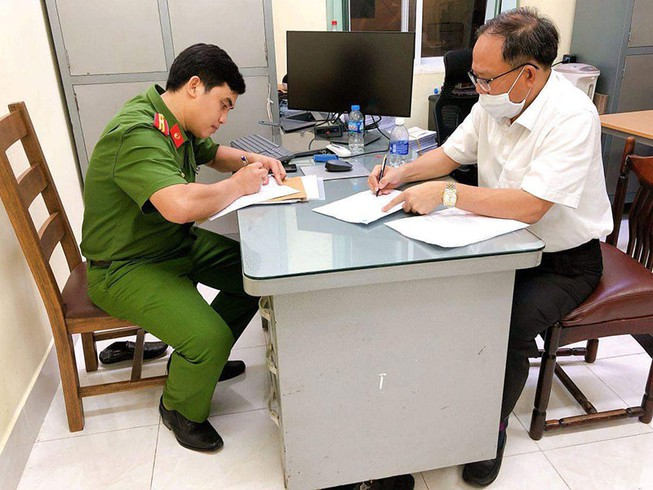 Cơ quan công an thực hiện các thủ tục tống đạt quyết định khởi tố, lệnh bắt tạm giam đối với ông Tất Thành Cang. (Ảnh: báo Pháp luật TP HCM)