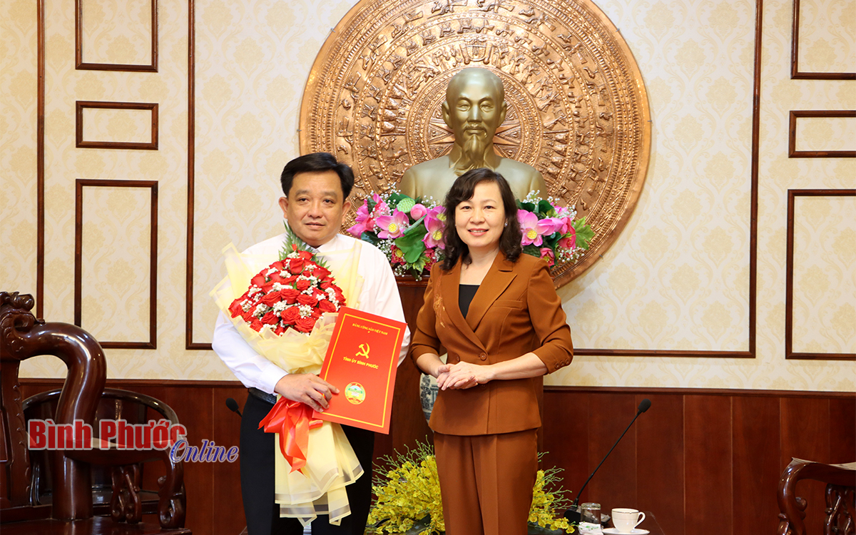 Phó Bí thư Thường trực Tỉnh ủy, Chủ tịch HĐND tỉnh Huỳnh Thị Hằng tặng hoa và trao quyết định bổ nhiệm chức vụ Phó Trưởng ban Tổ chức Tỉnh ủy đối với ông Trần Hữu Thuận. (Ảnh: báo Bình Phước)