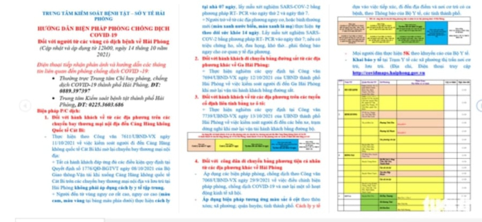 Hướng dẫn cho người đến Hải Phòng từ các vùng cũng khác nhau: nếu ở vùng màu cam, màu vàng sẽ phải cách ly tại nhà 7 ngày; tỉnh xanh lá mạ, xanh nước biển thì tự theo dõi sức khỏe tại nhà 14 ngày, tỉnh màu trắng chỉ cần khai báo y tế, thực hiện 5K. Người đi xe cá nhân từ vùng cam chưa tiêm vắc xin, chưa đủ mũi phải cách ly tập trung 14 ngày.