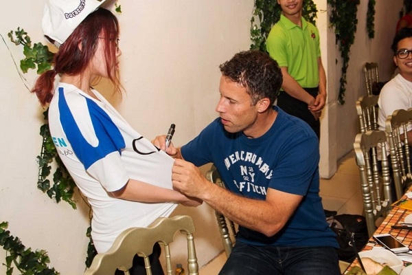 Vốn là một fan của bóng đá, rocker Phạm Anh Khoa cũng có mặt tại buổi tối qua để trò chuyện, giao lưu và tận mắt nhìn thấy hai thần tượng của CLB MU. Bà xã của anh cũng ‘trốn con” đi cùng chồng đến buổi giao lưu.