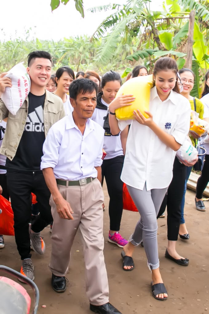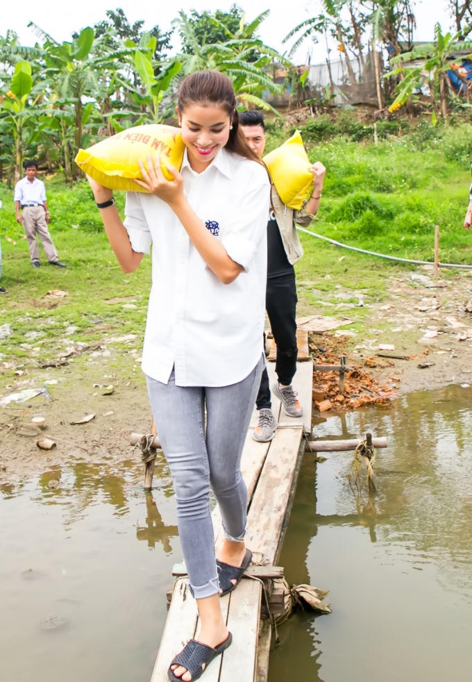 Hoa hậu Hoàn vũ Việt Nam 2015 Phạm Hương cùng FC Hà Nội đã vừa thực hiện chương trình thăm và tặng quà cho 27 hộ dân nghèo ở bãi giữa sông Hồng, đồng thời tặng 18 con heo đất cho các em học sinh nơi đây.