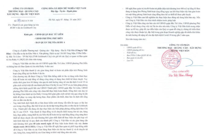 Công văn gửi cơ quan chức năng về việc thanh lý các gian hàng tại tòa Ruby 4