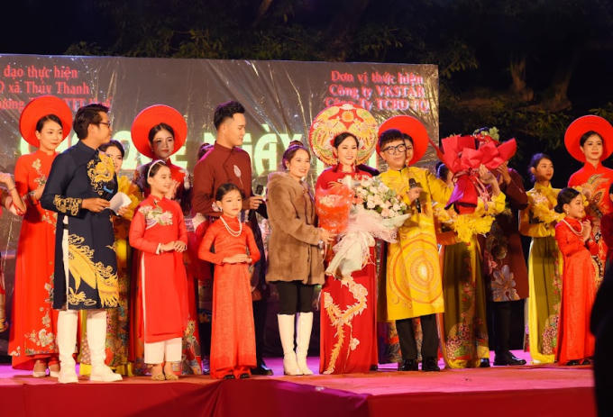 Tổng đạo diễn chương trình, nhà thiết kế Lan Vy biểu diễn áo dài Huế trong tiết mục hát của ca sĩ Long Nhật.