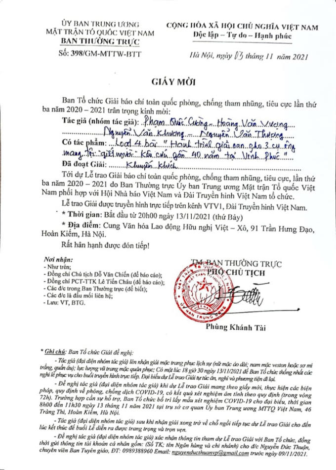Đặc biệt hơn, đúng vào dịp kỷ niệm sinh nhật ngày chính thức ra mắt của Phapluatplus.vn; Báo Pháp luật Việt Nam của chúng tôi lại đón nhận thông báo tin vui từ Giải Báo chí toàn quốc phòng, chống tham nhũng, tiêu cực năm 2020 - 2021 do Ủy ban Trung ương Mặt trận Tổ quốc Việt Nam tổ chức, trao giải Khuyến khích cho nhóm tác giả: Phạm Quốc Cường (Quốc Minh) - Hoàng Văn Vượng (Nhật Minh) - Nguyễn Văn Khương (Duy Khương) - Nguyễn Văn Thượng (Nguyễn Thượng) với loại 4 bài viết: "Hành trình giải oan cho 3 cụ ông mang tội 'giết người' kêu cứu gần 40 năm ở Vĩnh Phúc". Đây là một món quà ý nghĩa cho sinh nhật Pháp luật Plus lần thứ 6 (09/11/2015 - 09/11/2021).