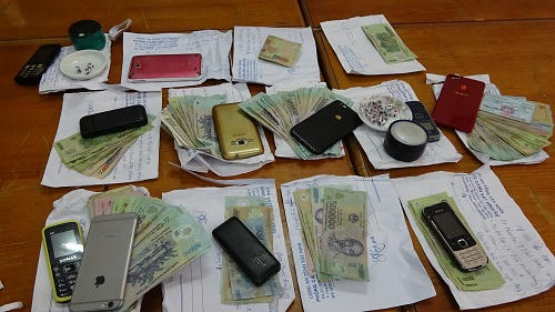 Tại hiện trường, Công an phát hiện 14 đối tượng đánh bạc và thu giữ tang vật gồm, 1 máy trò chơi điện tử bắn cá, 9 ĐTDĐ, 6 xe máy, gần 33 triệu đồng.
