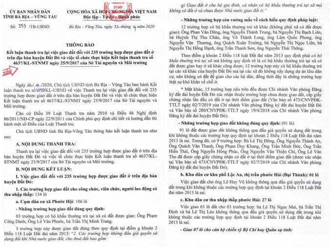 UBND tỉnh Bà Rịa - Vũng Tàu có KLTT chỉ rõ sai phạm trong việc giao đất tại huyện Đất Đỏ, trong đó có 196/235 lô đất bị giao sai quy định.