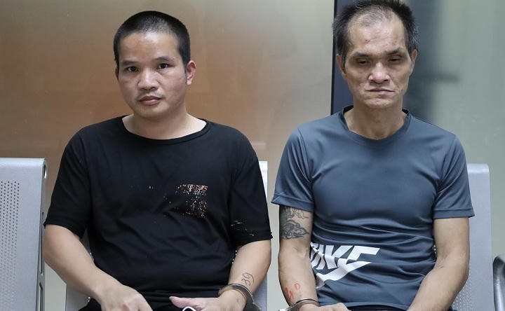 Đối tượng Lừu Văn Kim (áo đen) và vũ Văn Thắng (áo xám).