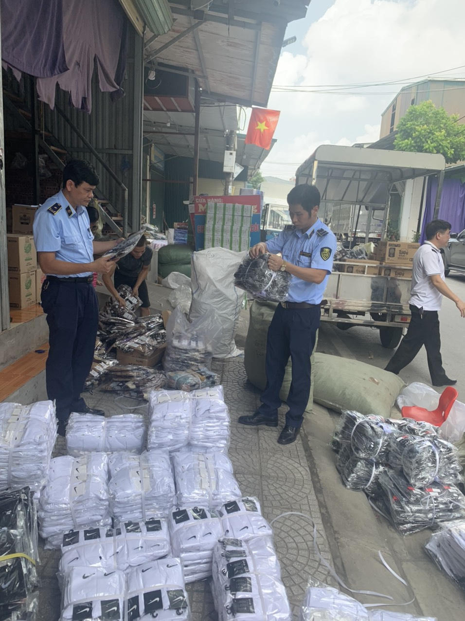 Đội Quản lý thị trường số 5 đã tạm giữ toàn bộ hàng hóa vi phạm gồm 5.500 đôi tất đi chân nhãn hiệu NIKE và hình của NIKE; 1.300 đôi tất đi chân nhãn hiệu LV (LOUIS VUITTON). Toàn bộ số hàng hóa nêu trên giả mạo nhãn hiệu NIKE, nhãn hiệu LV (LOUIS VUITTON) đang được bảo hộ tại Việt Nam.