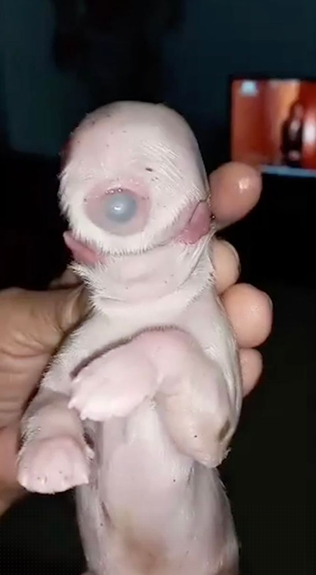Đoạn video được thực hiện vào thứ Bảy ngày 6/2 vừa rồi cho thấy chú chó con đột biến có tên "Cyclops" (tên vị thần có con mắt giữa trán) sở hữu làn da nhợt nhạt và đang vật lộn để thở trong khi được chủ bế trên tay.