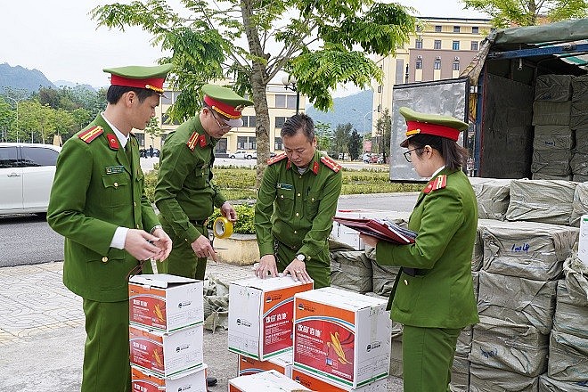 | Lực lượng chức năng kiểm đếm số hàng hóa bị thu giữ tại Cơ quan Công an. (Ảnh: Công an Hà Giang). |