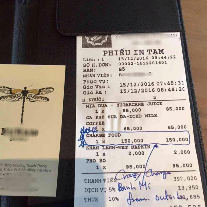 Tô phở chỉ có 95 nghìn mà mang ổ bánh mỳ vào bị tính phí đến 150 nghìn, nhìn mà cứ ngỡ nhân viên đánh nhầm 15 nghìn thành 150 nghìn. Hỏi lại nhân viên thì đúng thật 150 nghìn, đã vậy còn phụ thu thêm 15% VAT và phí phục vụ, ui trời mình cứ nghĩ ít ra thì phí bằng ổ bánh họ bán thôi chứ. Thật không biết nói sao luôn".