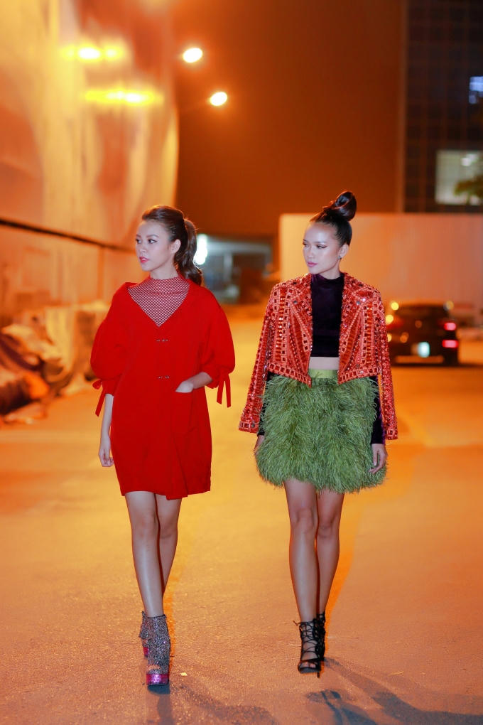 Trước buổi quay, Phí Phương Anh và Ngọc Châu khá thân thiết ở hậu trường. Cả hai cùng đọc kỹ kịch bản, thậm chí trêu đùa nhau một cách vui vẻ. Bộ đôi chân dài 9X còn tự tin sải bước và đọ khả năng catwalk trước ống kính.