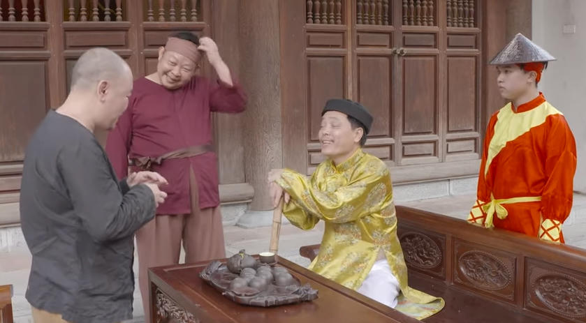 Một cảnh mang tên "Xử án trộm giấy" trong phim hài dân gian Trạng Lợn.
