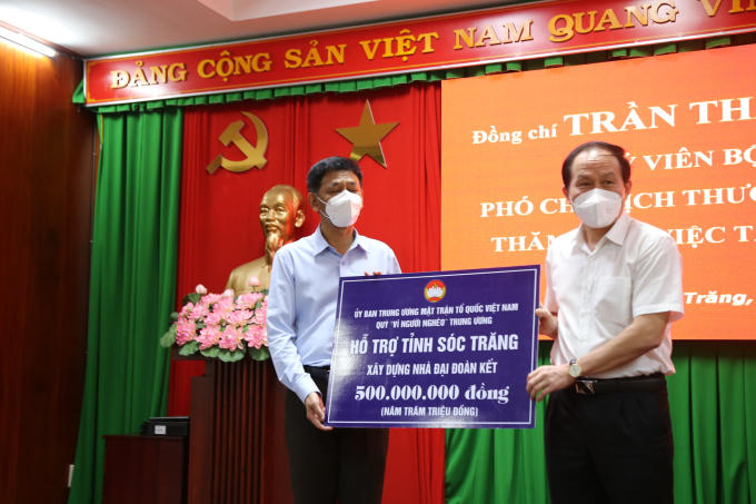 Sau đó, Phó Chủ tịch Thường trực Quốc hội Trần Thanh Mẫn và đoàn công tác trao tặng tỉnh Sóc Trăng 1 tỷ đồng và 10 căn nhà Đại đoàn kết trị giá 500 triệu đồng để hỗ trợ tỉnh trong công tác phòng chống dịch.