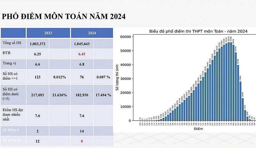 Sau khi công bố điểm thi, Bộ Giáo dục và Đào tạo đồng thời công bố phổ điểm Kỳ thi Tốt nghiệp trung học phổ thông năm 2024. Trong tổng số 9 môn, có hơn 10.00 bài thi đạt điểm 10, chỉ có môn Toán là không có thí sinh điểm tối đa.