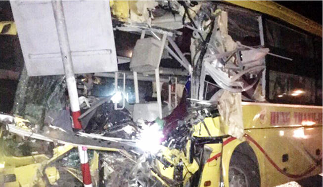 Cú va chạm giữa xe ô tô khách BKS29B-600.50 với xe ô tô BKS 29C-560.77 kéo theo romooc BKS 29R-040.42 đã khiến 2 người và 7 người bị thươn.