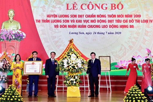 Thừa ủy quyền lãnh đạo Đảng, Nhà nước, tại buổi lễ, Phó Thủ tướng Trịnh Đình Dũng đã trao Quyết định của Thủ tướng Chính phủ về việc công nhận huyện Lương Sơn, tỉnh Hòa Bình đạt chuẩn nông thôn mới năm 2019; trao tặng Huân chương Lao động hạng Ba cho Đảng bộ, chính quyền và nhân dân các dân tộc huyện Lương Sơn.