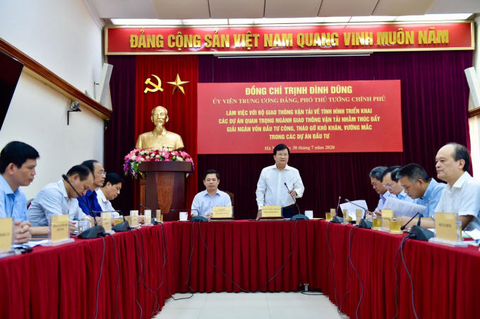 Ngày 30/7, Phó Thủ tướng Chính phủ Trịnh Đình Dũng có buổi làm việc chuyên đề nhằm kiểm tra, đôn đốc, tháo gỡ khó khăn, vướng mắc trong sản xuất kinh doanh, đẩy mạnh giải ngân vốn đầu tư công năm 2020 đối với các dự án của ngành GTVT.