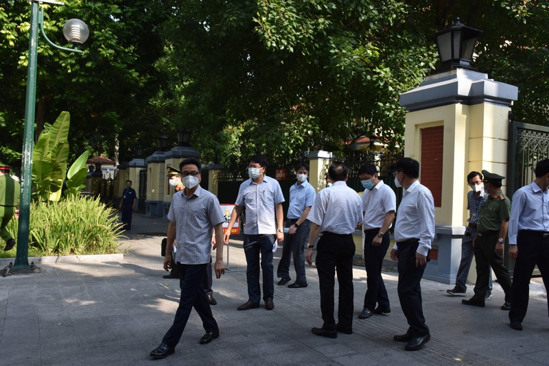 Phó Thủ tướng Chính phủ Vũ Đức Đam (người ngoài cùng bên phải) kiểm tra công tác phòng, chống dịch Covid-19 tại Bộ Tư pháp.