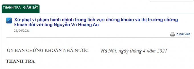 Ngày 22/4/2021, Thanh tra Ủy ban Chứng khoán Nhà nước (UBCKNN) đã ban hành Quyết định số 70/QĐ-XPVPHC về việc xử phạt vi phạm hành chính số tiền 15 triệu đồng, vì đã có hành vi vi phạm hành chính "Công bố thông tin không đúng thời hạn về kết quả thực hiện giao dịch", trong lĩnh vực chứng khoán và thị trường chứng khoán đối với ông Nguyễn Vũ Hoàng An (địa chỉ: 47 Trần Quý Cáp, thành phố Nha Trang, tỉnh Khánh Hòa).