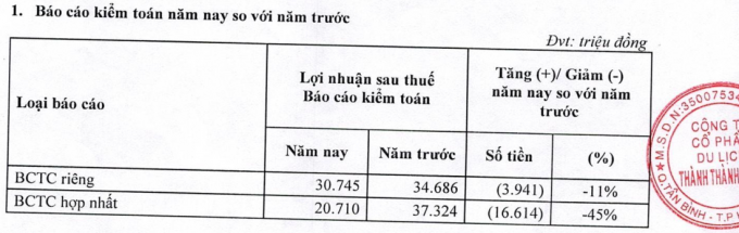Cụ thể, Công ty Cổ phần Du lịch Thành Thành Công giải trình biến động sau thuế và báo cáo sau kiểm toán: