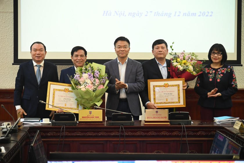 Đồng chí Đặng Hoàng Oanh và đồng chí Nguyễn Kim Tinh trao Bằng khen của Ban Tuyên giáo Trung ương cho Chi bộ Cục Công tác phía Nam và Bằng khen của Đảng bộ Khối các cơ quan Trung ương cho đồng chí Nguyễn Hồng Diện, Chi bộ Thanh Tra và đồng chí Hà Ánh Bình, Chi bộ Khối các cơ quan đại diện, Đảng bộ Báo Pháp luật Việt Nam đạt tiêu chuẩn đảng viên hoàn thành xuất sắc nhiệm vụ 5 năm liền 2017-2021.