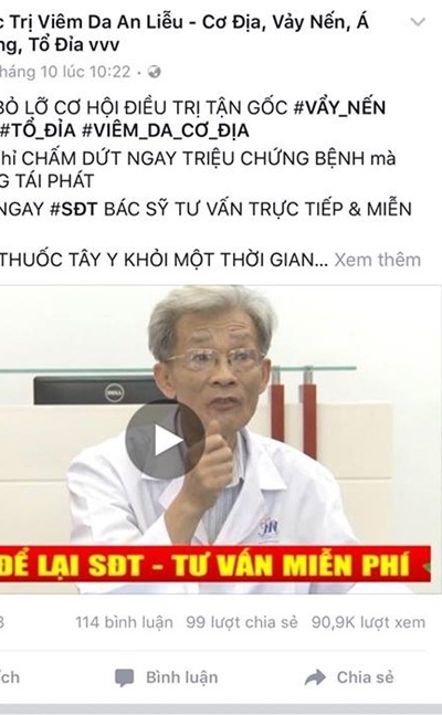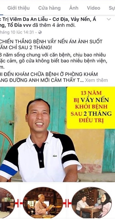 "Tháng 9-10/2016, tình cờ thông qua mạng xã hội, tôi phát hiện một tài khoản Facebook mang tên "Đặc trị viêm da An Liễu - Cơ địa, vảy nến, á sừng, tổ đỉa" của cơ sở phòng khám Thiệu Khang Đường (số 7 ngõ 102 Khuất Duy Tiến - Thanh Xuân - Hà Nội) có sử dụng hình ảnh ghi lại quá trình điều trị bệnh tại Thiên Phú Đường của tôi với mục đích quảng cáo.