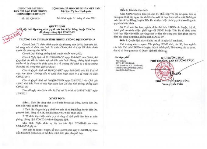 Quyết định nêu rõ: Bắt đầu từ 21 giờ 00 phút ngày 31/8, thiết lập vùng cách ly y tế toàn bộ xã Đại Đồng, huyện Tiên Du, gồm 4 thôn, tổng số 4.082 hộ gia đình với 30.410 nhân khẩu. Việc tổ chức thực hiện cách ly y tế vùng có dịch đảm bảo an toàn phòng, chống dịch Covid-19 theo quy định.