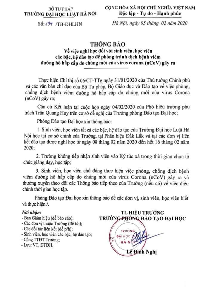Ngày 05/02, Trường Đại học Luật Hà Nội vừa có thông báo cho sinh viên, học viên của tất cả các bậc, hệ đào tạo tại cơ sở chính của trường, tại phân hiệu Đắk Lắk và tại các đơn vị liên kết đào tạo được nghỉ học từ ngày 08/02/2020 đến hết ngày 16/02/2020.