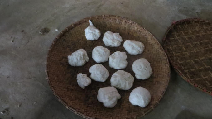 Khi các chàng trai khỏe mạnh lực lưỡng giã bánh thì các bà các cô chuẩn bị lá chuối để gói bánh. Bánh giã xong được chuyển ra mẹt đã láng lòng đỏ trứng gà cho khỏi dính.