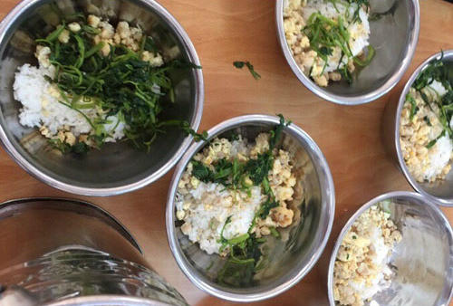 Trong bữa ăn, mỗi học sinh được phát một bát inox, sau khi ăn thức ăn khô các em sẽ xin canh ăn tiếp hoặc ngược lại. "Hầu hết trường đều làm như thế chứ không có khay phân chia thức ăn cho mỗi học sinh", ông Hà thông tin.